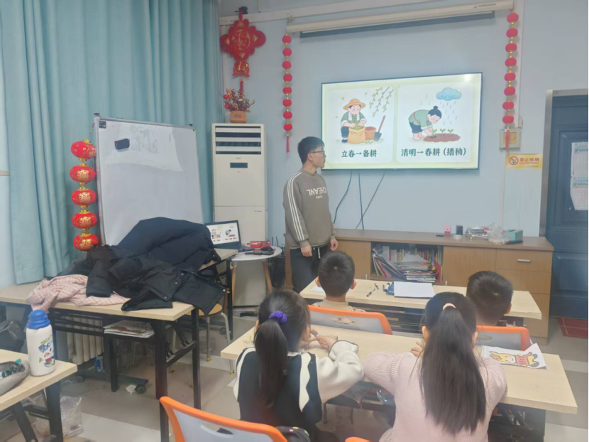 2月14日,山东大学甸柳新芽支教队走进甸柳新村街道甸北社区支教点,开展了一场别开生面的传统文化科普活动。本次活动以“二十四节气:藏在时光里的农耕智慧”为主题,支教队员季增志将古老节气知识与趣味课堂深度融合,带领孩子们在互动体验中触摸农耕文明,感受中华优秀传统文化的独特魅力。